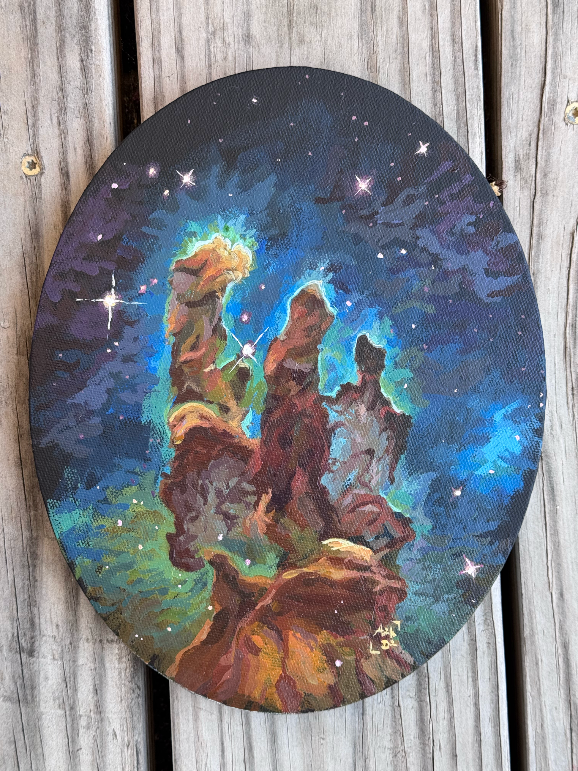 The Pillars of Creation have been a recurring motif throughout my life. Discovered the same year I was born, I've always felt connected to this nebula. Painting it in abstract tendrils on this unique canvas shape just felt right.