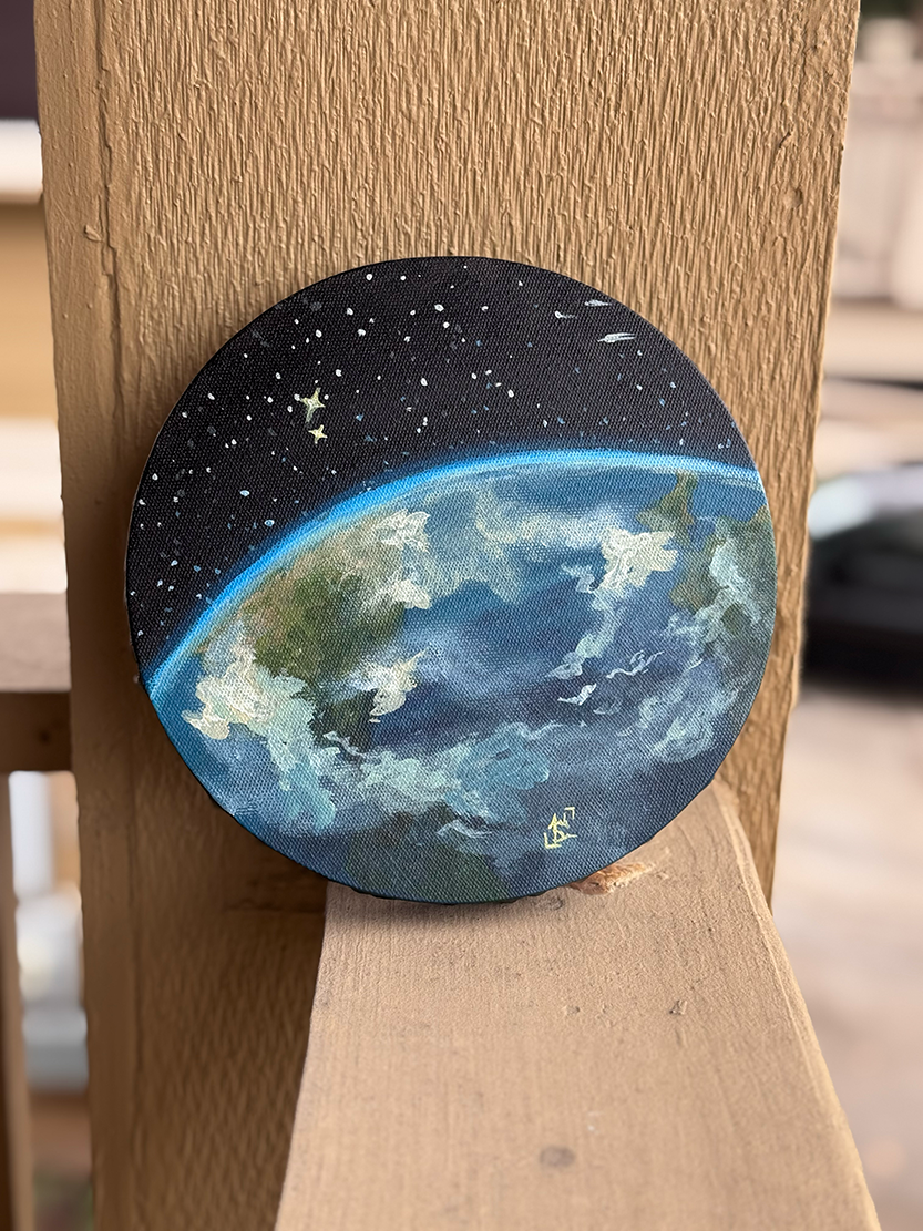 8x8 Acrylic on Round Canvas, sealed with varnish for protection. Hanging hardware installed.